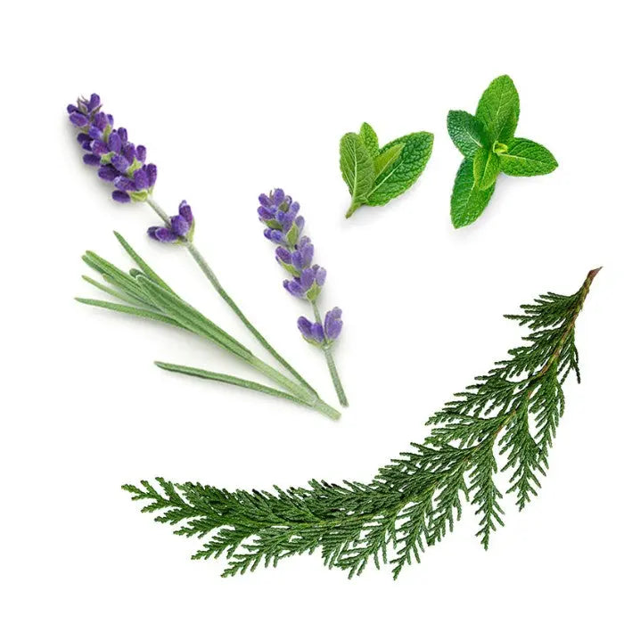 Cupressus sempervirens Öl, Mentha piperita Öl, Origanum majorana Blatt-Öl, Ocimum basilicum Öl, Citrus paradisi Schalen-Öl, Lavandula angustifolia Öl, Linalool*, Limonen*, Eugenol*
