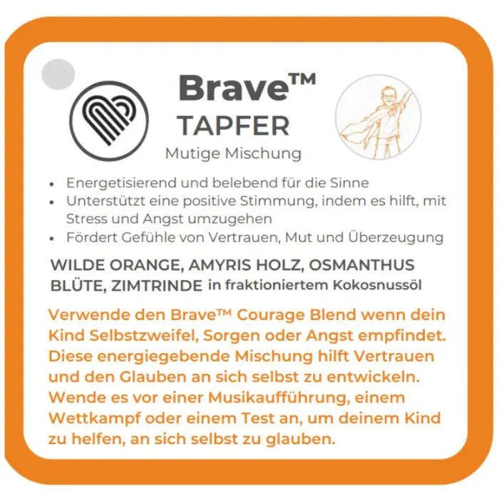 Das helle, warme Aroma von Brave stärkt Kinder emotional. Vor Prüfungen, Veranstaltungen oder Veränderungen – ein Tropfen Brave auf Fußsohlen und Handrücken kann Selbstvertrauen und Mut stärken.