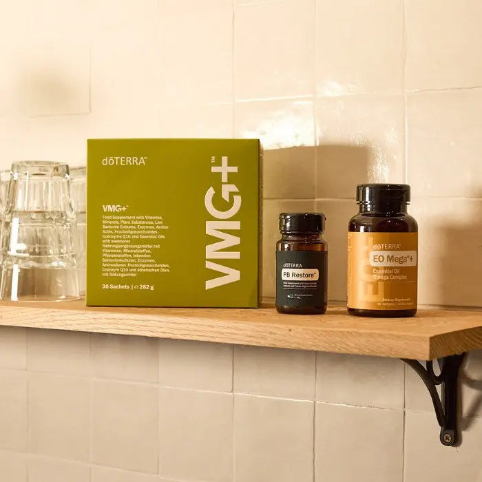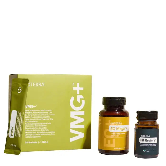 Das doTERRA Bundle „Wohlbefinden leicht gemacht“ kombiniert drei leistungsstarke Produkte: VMG+, EO Mega+ Softgels und PB Restore. Es wurde speziell für Menschen entwickelt, die ihre Gesundheit mit praktischen Lösungen im Alltag fördern möchten.