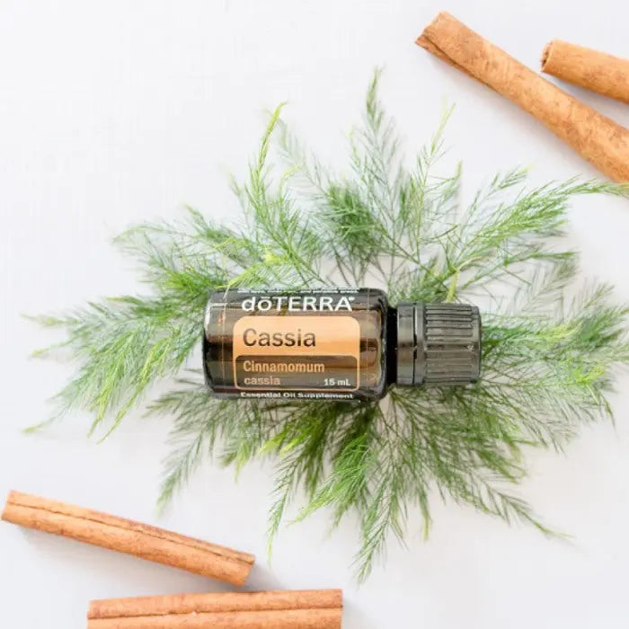doTERRA Cassia (ätherisches Kassiaöl) ist ein intensiv würziges, warmes Öl, das eng mit Zimt verwandt ist. Es eignet sich hervorragend für Küche, Aromatherapie und wohltuende Massagen.
