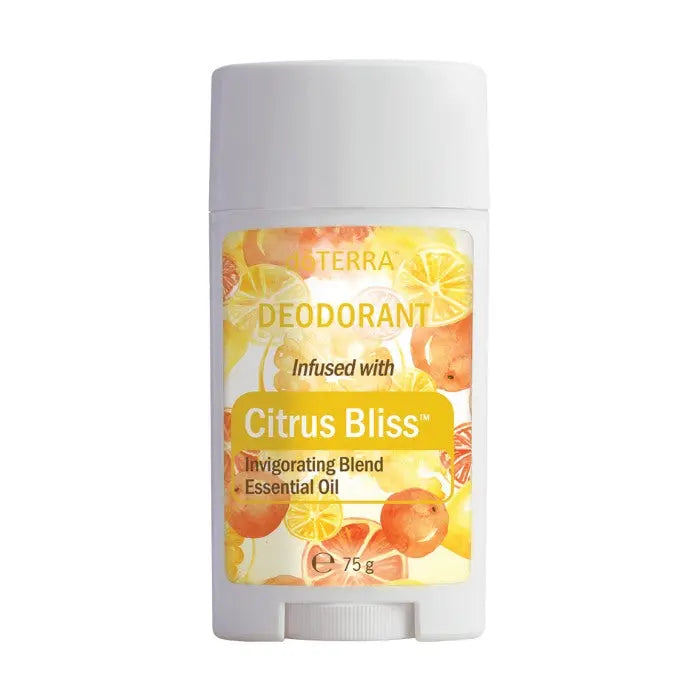 Das doTERRA Citrus Bliss Deodorant kombiniert eine geschützte Mischung ätherischer Öle mit Speisenatron für aktiven Geruchsschutz und Tapiokastärke zur Feuchtigkeitsabsorption.