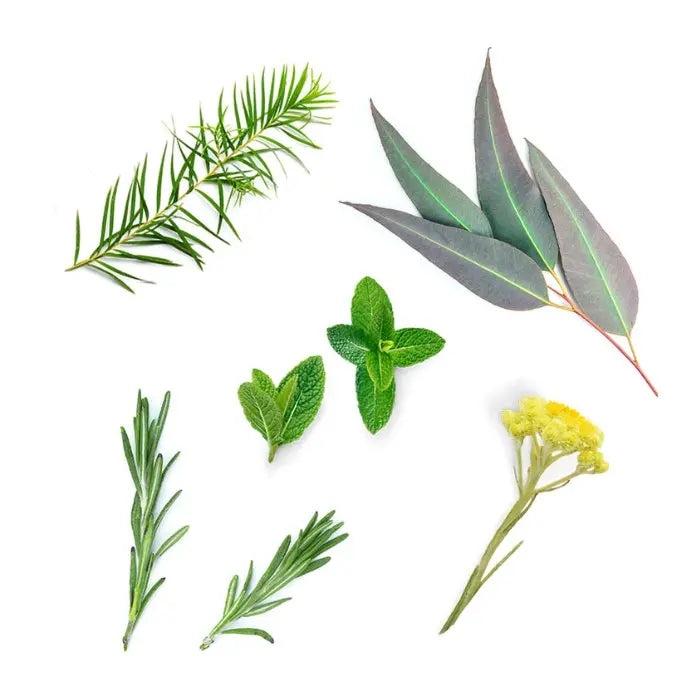 Kokosnussöl (Cocos nucifera), Japanische Minze (Mentha canadensis), Rosmarin (Rosmarinus officinalis), Copaiba (Copaifera spp.), Sternanis (Illicium verum), Orangenminze (Mentha citrata), Pfefferminze (Mentha piperita), Blauer Eukalyptus (Eucalyptus globulus), Teebaum (Melaleuca alternifolia), Strohblume (Helichrysum italicum), Kamille (Chamomilla recutita), Blauer Rainfarn (Tanacetum annuum), Wintergrün (Gaultheria procumbens), Linalool*, Limonen*