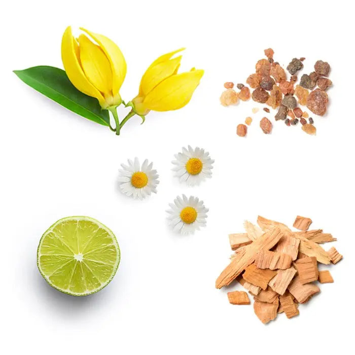 Westindisches Sandelholzrindenöl (Amyris balsamifera), Indisches-Patschuli-Öl (Pogostemon cablin), Limettenschalenöl (Citrus aurantifolia), Ylang-Ylang-Blütenöl (Cananga odorata), Weihrauchöl (Boswellia carterii), Somalischer-Weihrauch-Harzöl (Boswellia sacra), Australisches Sandelholzöl (Santalum spicatum), Sandelholzöl (Santalum album), Äthiopischer-Weihrauch-Harzöl (Boswellia papyrifera), Römische-Kamille-Blütenöl (Anthemis nobilis), Königsweihrauch-Harzöl (Boswellia frereana), Hawaiianisches Sandelholzöl (Santalum paniculatum)