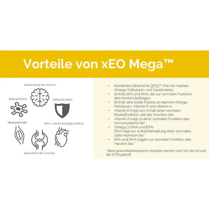 xEO Mega™ kombiniert CPTG™-Öle mit marinen Omega-3-Fettsäuren. Unterstützt Herz, Gehirn, Haut und Gelenke mit wichtigen Nährstoffen wie EPA, DHA, Vitamin A und D.
