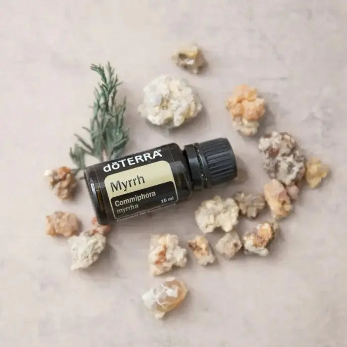doTERRA Myrrh (Myrrhe), gewonnen aus dem Harz des Commiphora-Baumes, zählt zu den ältesten ätherischen Ölen der Welt. In Kombination mit Frankincense (Weihrauch) wird sie als königliches Öl verehrt – mit vielfältigen Vorteilen für Haut und Wohlbefinden.