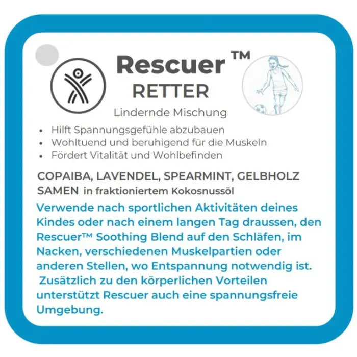 doTERRA Rescuer verströmt ein frisches und beruhigendes Aroma, das Vitalität und Wohlbefinden fördert. Tragen Sie diese lindernde Mischung auf, um nach einem ereignisreichen Tag Spannungen zu lösen und Entspannung zu fördern – besonders hilfreich vor dem Schlafengehen für müde Kinderbeine.
