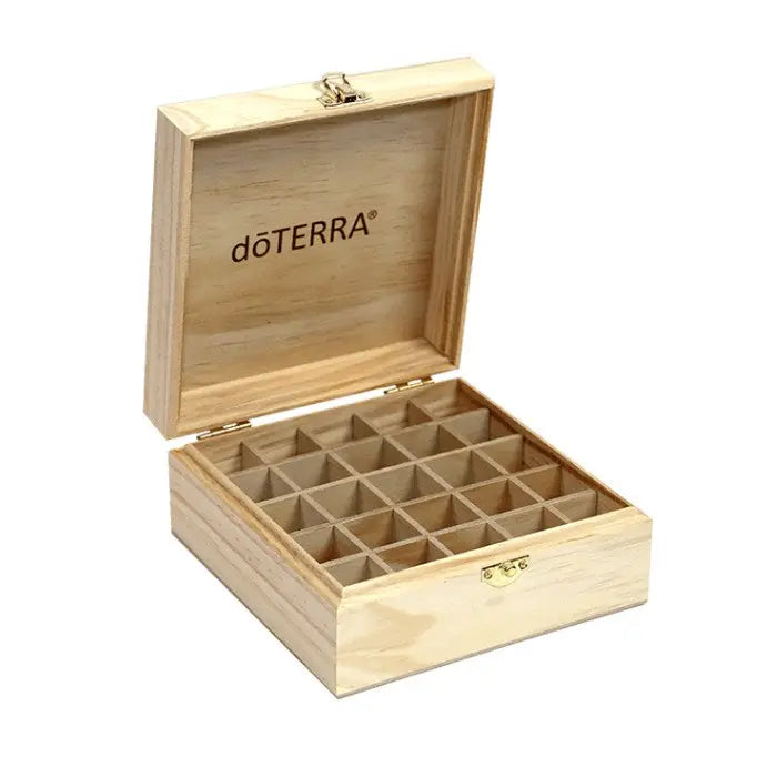 Diese leichte und kompakte Holzbox mit eingraviertem doTERRA Logo bietet Platz für 25 ätherische Öle und ist mit einem eingravierten Logo verziert – zur bequemen Mitnahme Ihrer Öle.